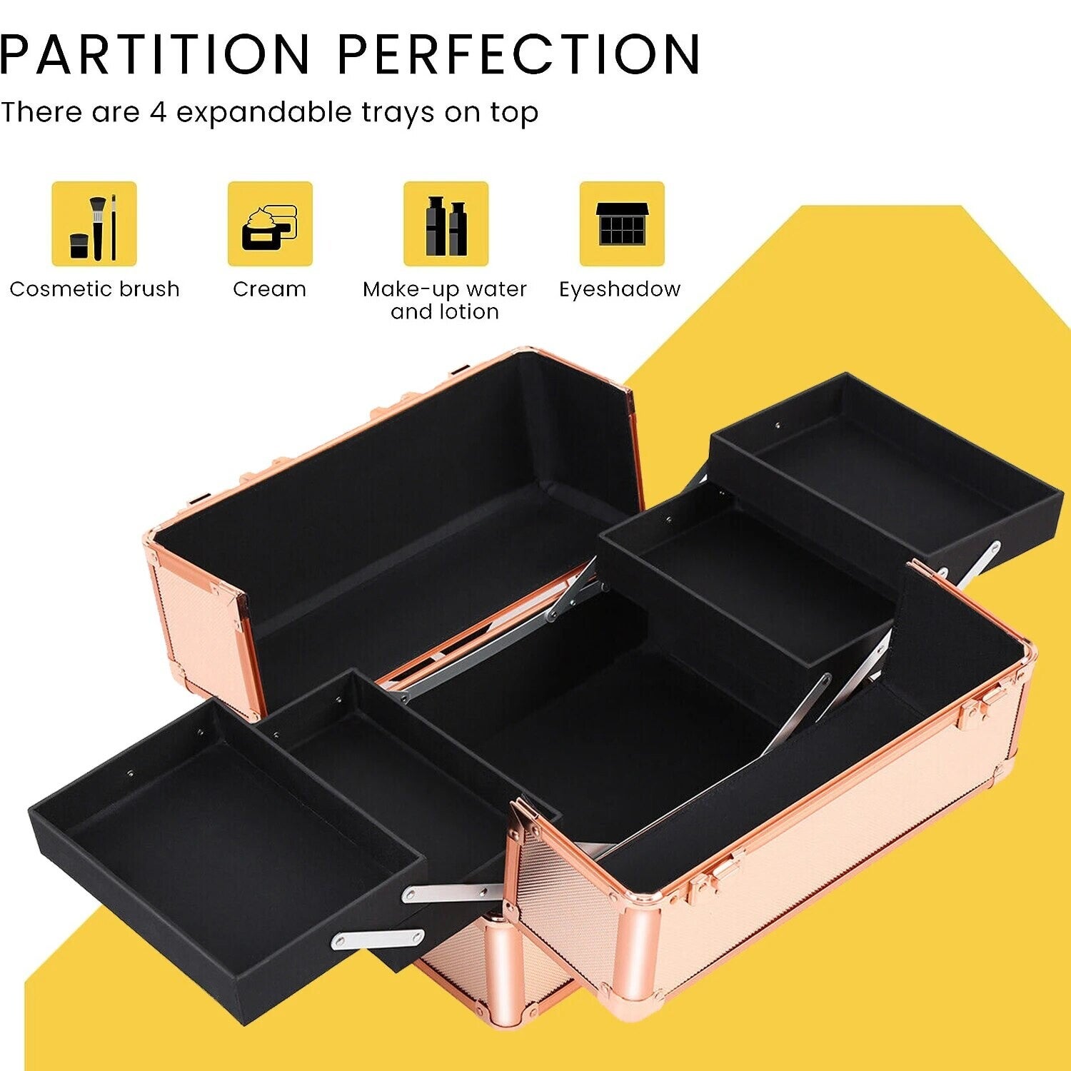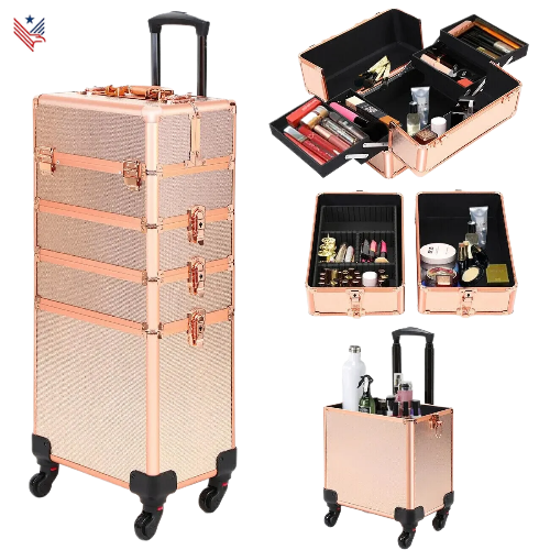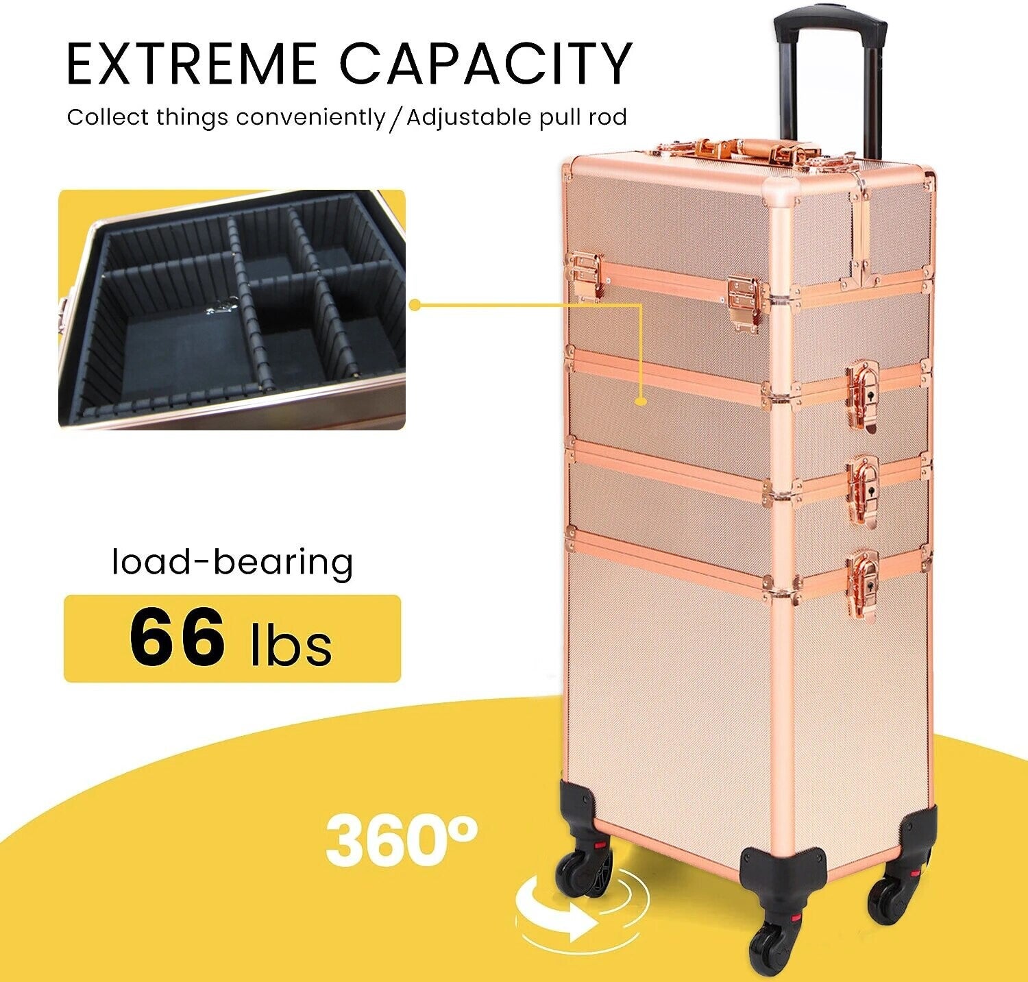 Ruime Opslag: Elk deel van de trolley case biedt ruime opslagruimte voor make-up, schoonheidsproducten, tools en accessoires. De verschillende compartimenten en lades zorgen voor een georganiseerde en overzichtelijke indeling, zodat je gemakkelijk toegang hebt tot al jouw benodigdheden.
