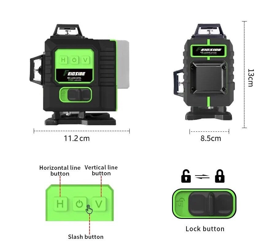 De groene laserlijnen zorgen voor een heldere en duidelijke projectie, zelfs in helder verlichte omgevingen, waardoor het gemakkelijker wordt om nauwkeurige metingen uit te voeren. Met 16 of 12 lijnen, afhankelijk van het model, biedt dit laserniveau een uitgebreide dekking en precisie voor het markeren van verschillende punten en lijnen op muren, plafonds en vloeren.