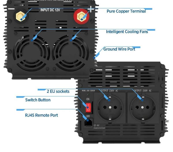 Dankzij zijn veelzijdigheid is deze omvormer ideaal voor gebruik in verschillende omgevingen, zoals thuis, in auto's, campers, boten en zelfs in off-grid zonne-energiesystemen. Het stelt gebruikers in staat om elektrische apparaten van stroom te voorzien, zelfs wanneer er geen traditionele netstroom beschikbaar is.