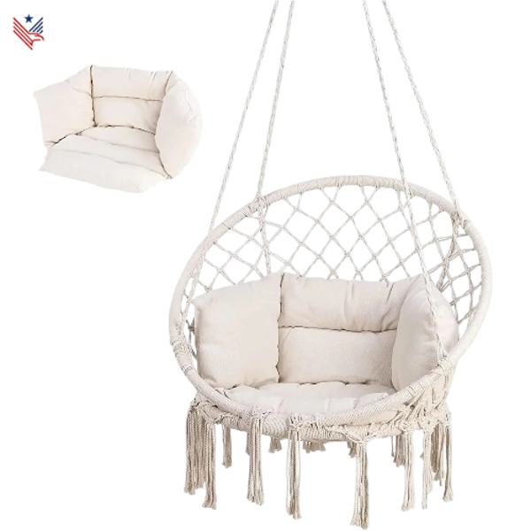 Met zijn stevige constructie en een laadvermogen van 100 kg, is deze hangstoel ontworpen om duurzaamheid en stabiliteit te bieden, zodat je met vertrouwen kunt ontspannen en genieten. Het wordt geleverd met een zacht kussen voor extra comfort, waardoor het de ideale plek is om een goed boek te lezen, een dutje te doen of gewoon te relaxen.