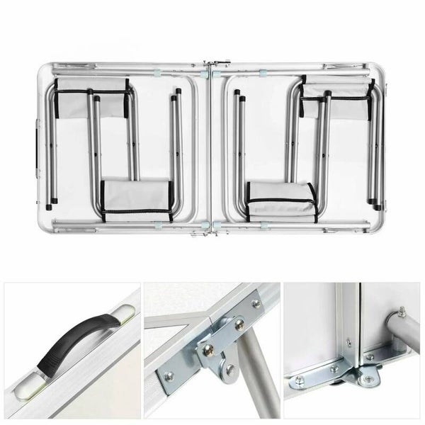 Of je nu gaat kamperen, picknicken of gewoon genieten van de natuur in je eigen tuin, deze aluminium kampeertafel met opvouwbare krukken biedt de perfecte oplossing voor comfortabel buiten zitten en dineren. Maak van je volgende buitenavontuur een onvergetelijke ervaring met deze handige en veelzijdige buitentafel en stoelen set.