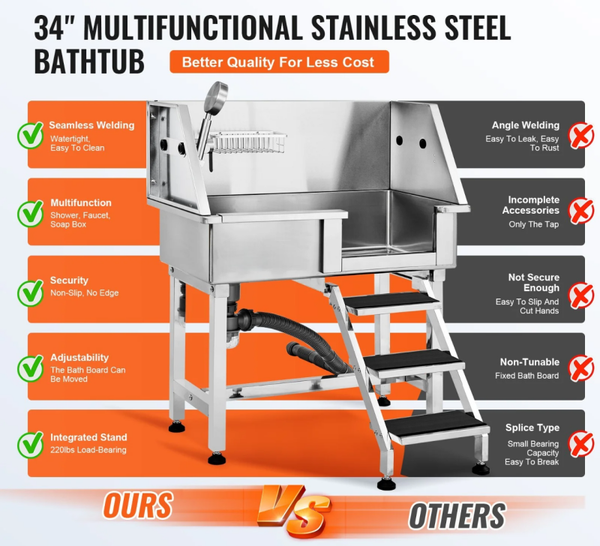 Naadloos 864 mm Ontwerp: Deze multifunctionele roestvrijstalen huisdierbadkuip is naadloos gelast en lekvrij. Ideaal voor huisdiereigenaren en professionele trimmers die op zoek zijn naar een veilige en probleemloze oplossing voor de verzorging van huisdieren.