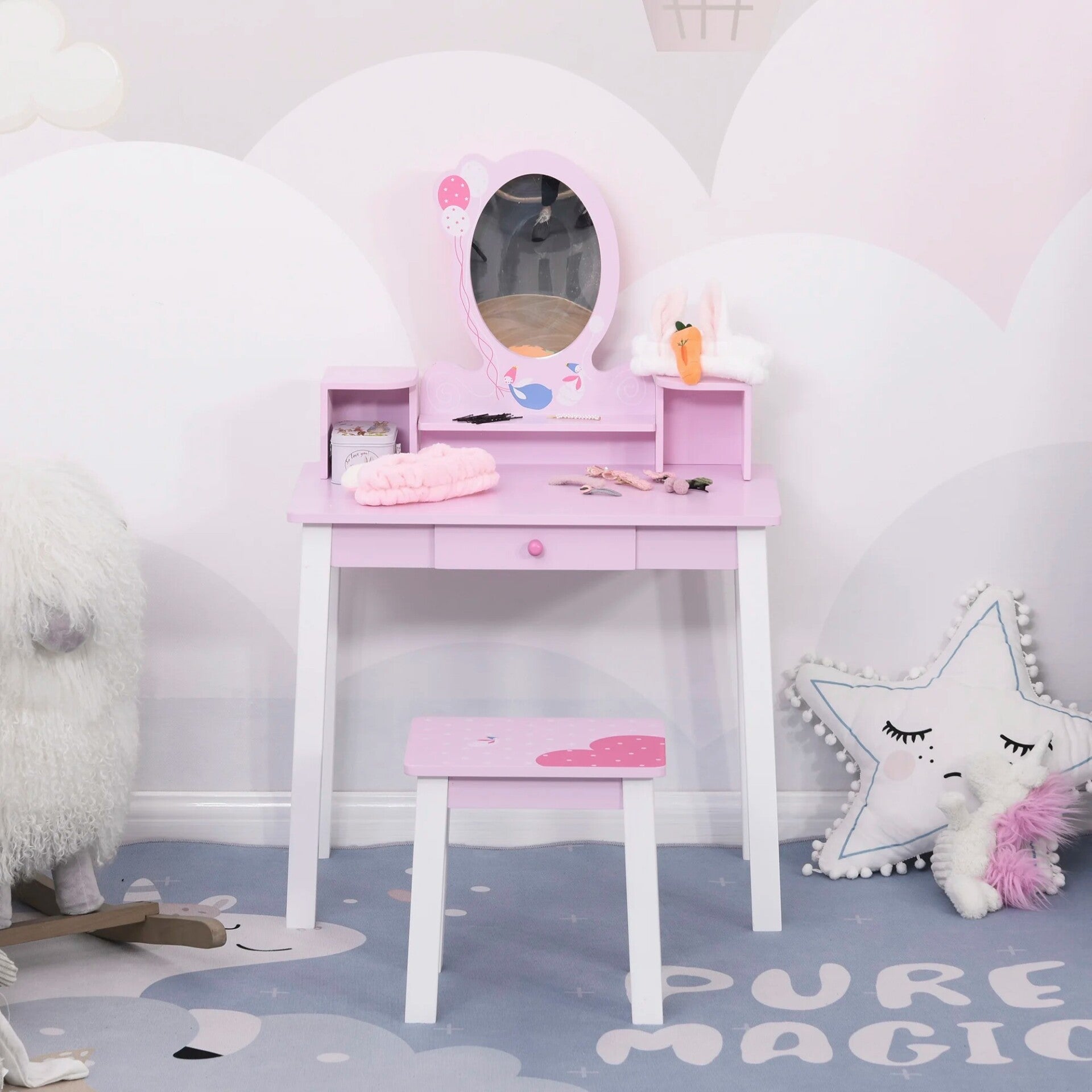 Deze schattige kinder toilettafel is ideaal voor meisjes vanaf 3 jaar en biedt een magische ervaring alsof ze een prinses zijn. Het elegante design in het roze maakt het niet alleen een functioneel meubel, maar ook een decoratief element voor de kinderkamer. De set is gemaakt van hoogwaardige dennenhout en MDF met milieuvriendelijke verf, waardoor het veilig is voor je kleintje.