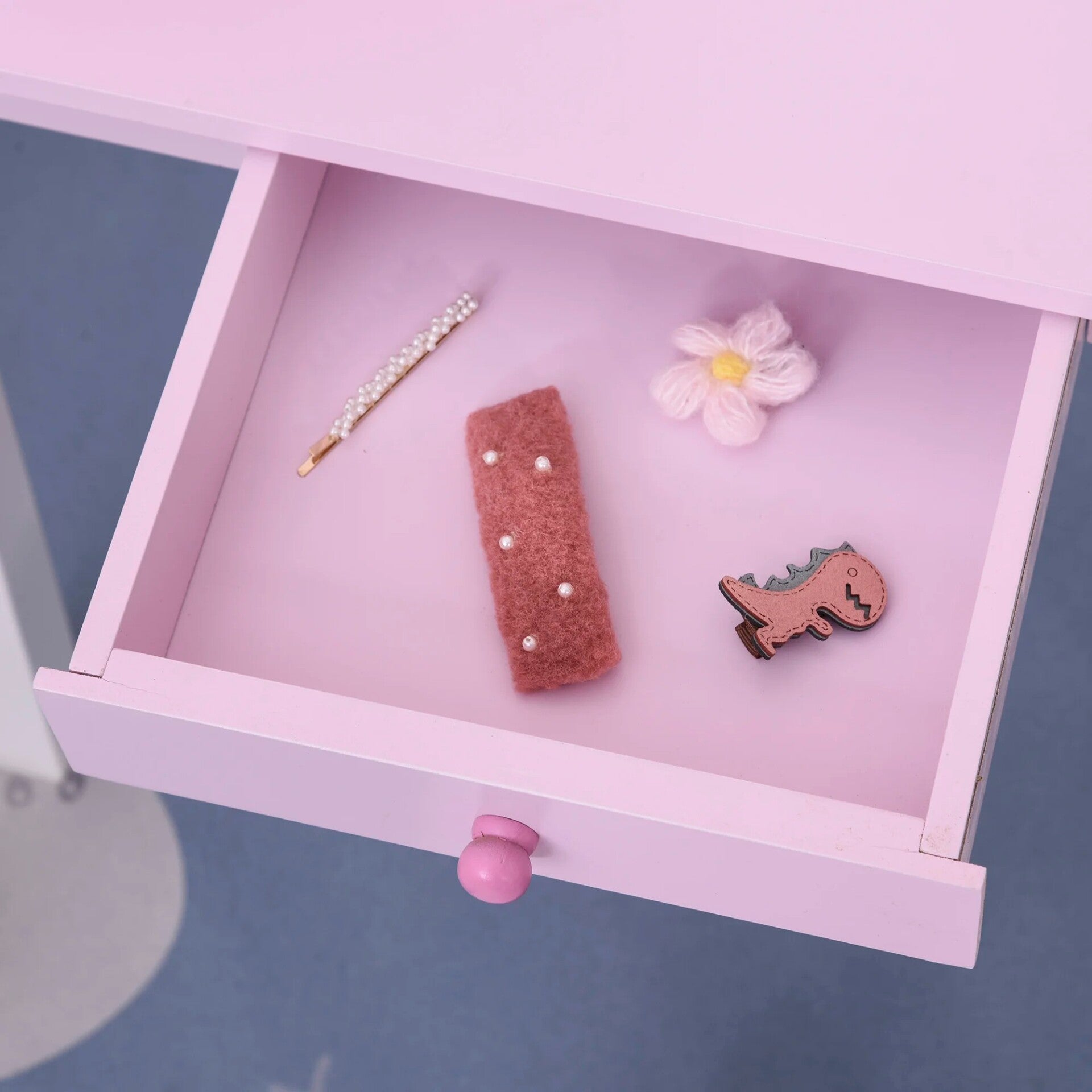 De set bevat een ruime tafel die ook als bureau gebruikt kan worden, een comfortabele kruk, een echt spiegel voor een heldere reflectie, en handige opbergmogelijkheden zoals een lade en twee planken. Perfect om kleine spulletjes op te bergen en haaraccessoires of speelgoed netjes te houden.