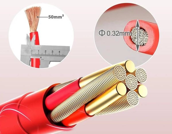 Deze krachtige startkabels zijn ideaal voor het snel starten van auto's, motoren of andere voertuigen met een zwakke batterij. De kabels zijn ontworpen voor zowel 12V als 24V systemen en bieden een maximale stroom van 3000A, geschikt voor zowel benzine- als dieselmotoren. De lange kabels van 6 meter en het dikke 50mm² draad zorgen voor een betrouwbare verbinding, zelfs bij voertuigen die ver uit elkaar staan. De set wordt geleverd met een praktische opbergtas en beschermende handschoenen voor extra veiligheid tijdens gebruik.