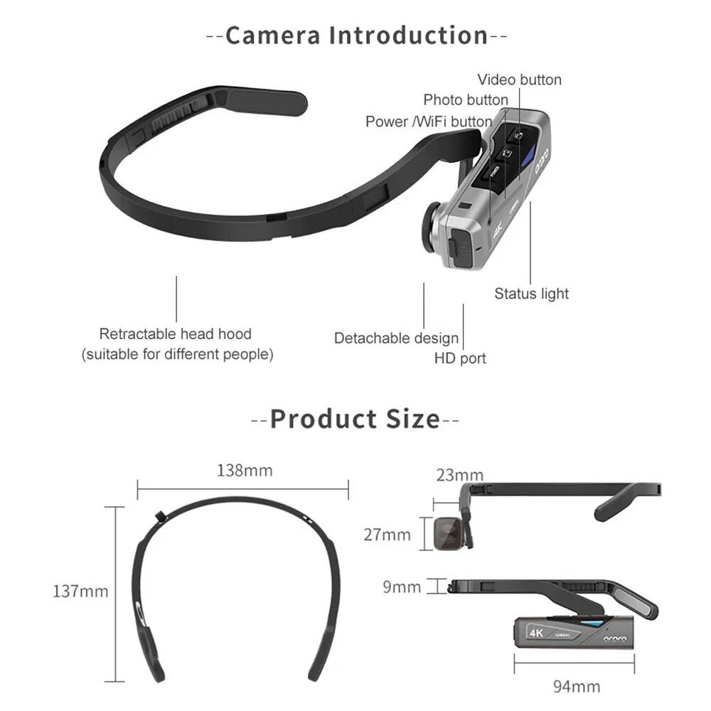 De draagbare 4K videocamera biedt een perfecte combinatie van beeldkwaliteit, stabiliteit, en gebruiksgemak, en is ideaal voor vloggers, sportliefhebbers, en avonturiers die hun ervaringen handsfree willen vastleggen.