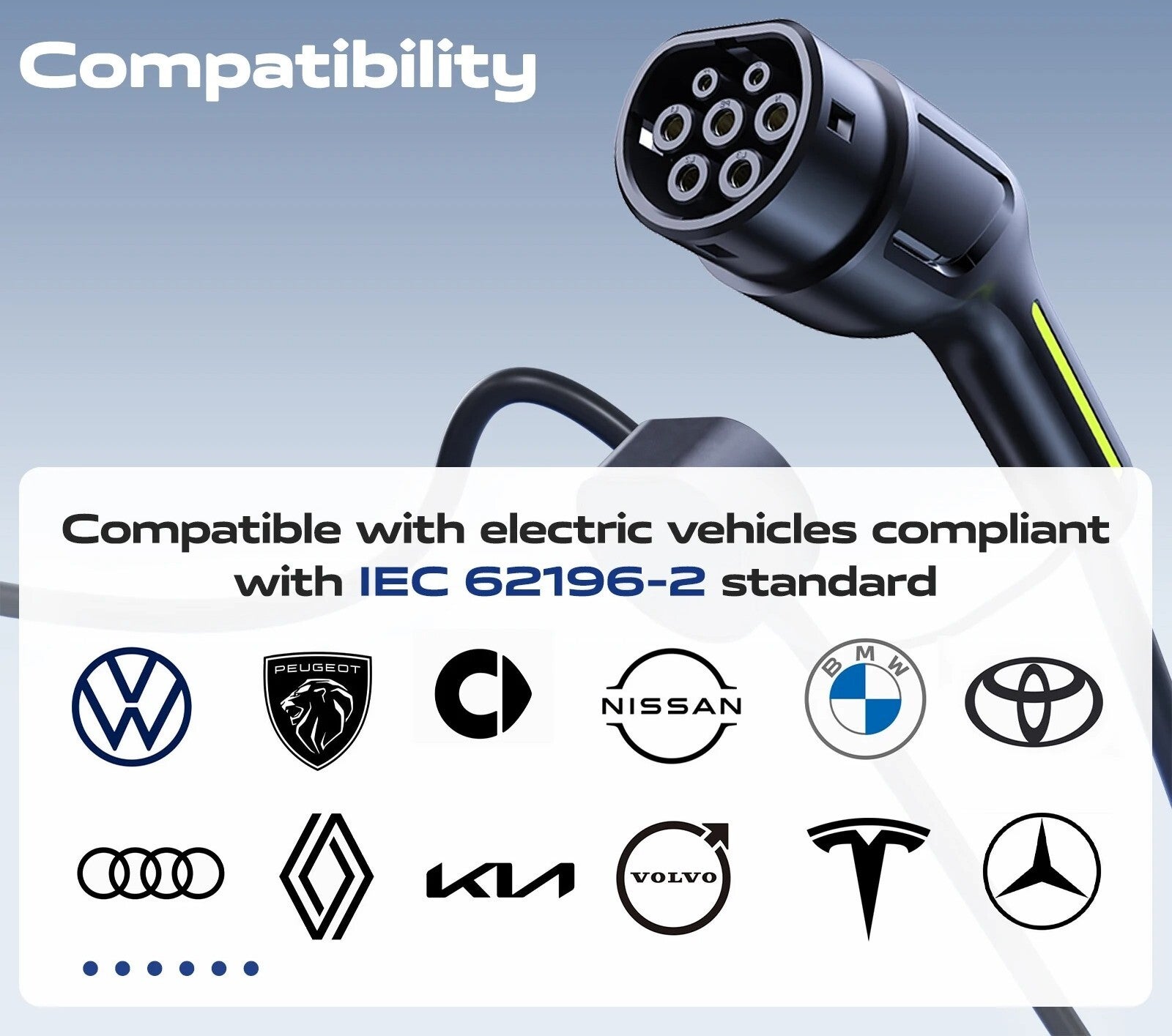 Deze lader is compatibel met Type 2 elektrische voertuigen en voldoet aan de EU-standaard IEC 62196-2. Bovendien is hij uitgerust met een 2-pins EU Schuko-stekker, wat betekent dat hij geschikt is voor vrijwel alle Europese aansluitingen.
