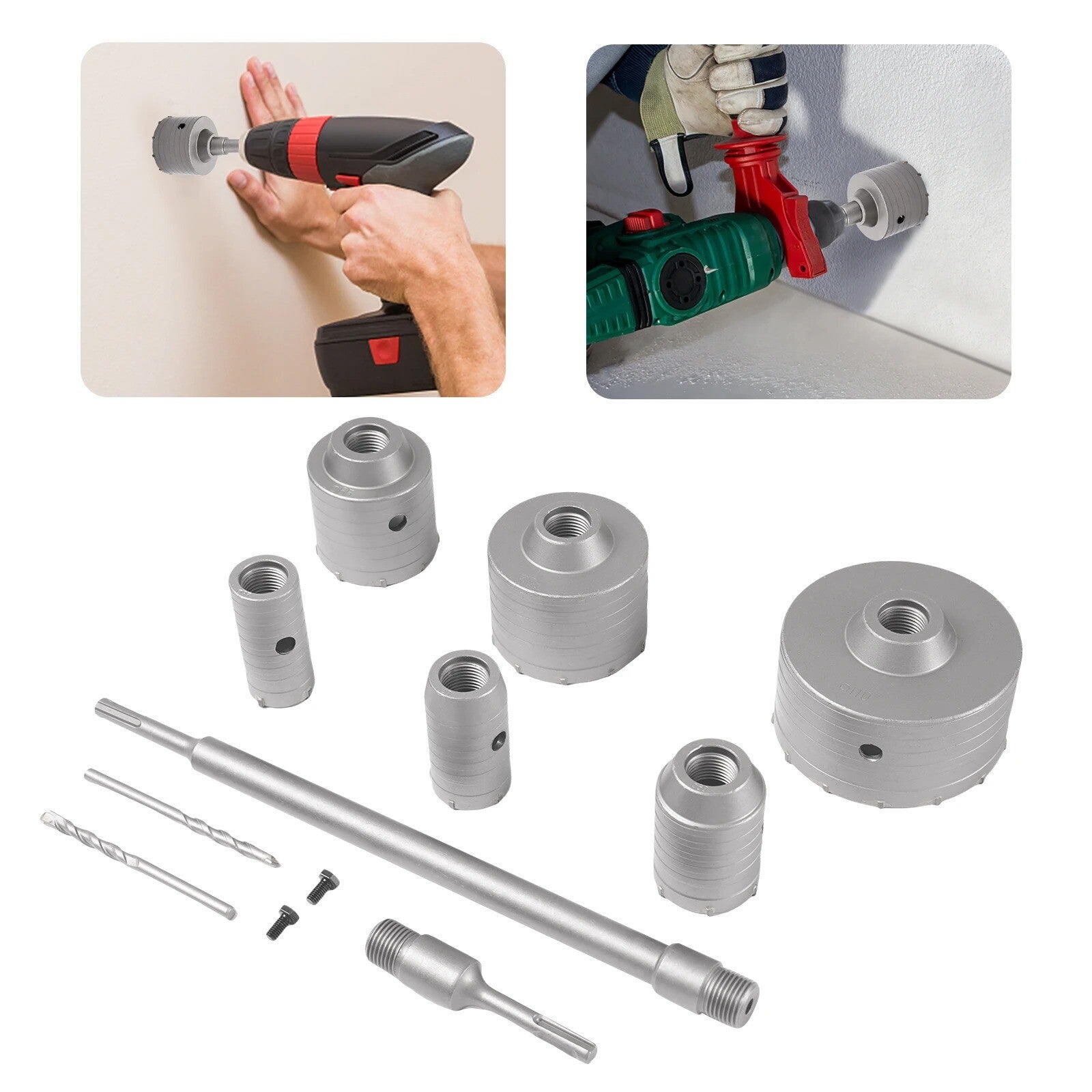 Boor moeiteloos door beton, baksteen en cement met deze complete betongatenzaagset. Ideaal voor installaties van airco’s, afzuigkappen, waterleidingen en meer. Deze set bevat 6 verschillende gatzagen, twee stevige drijfstangen en middenpositioneringsboren voor maximale precisie en efficiëntie.