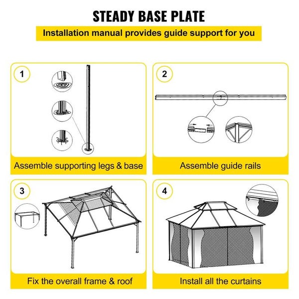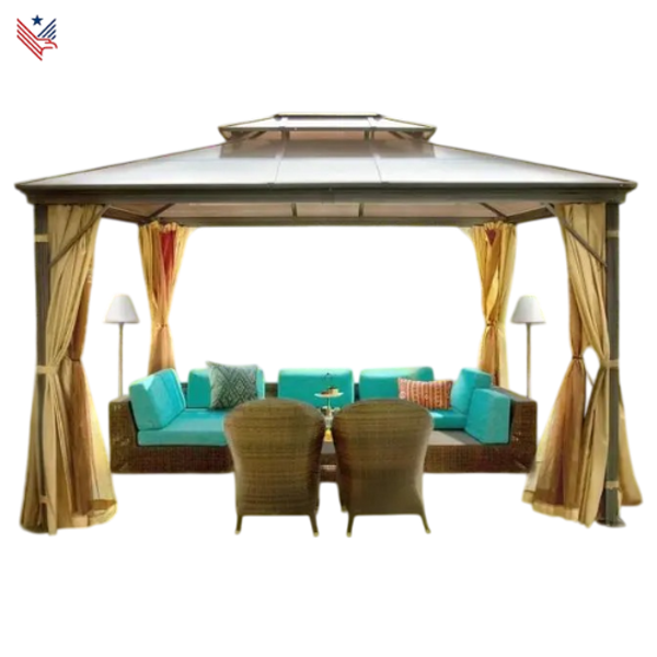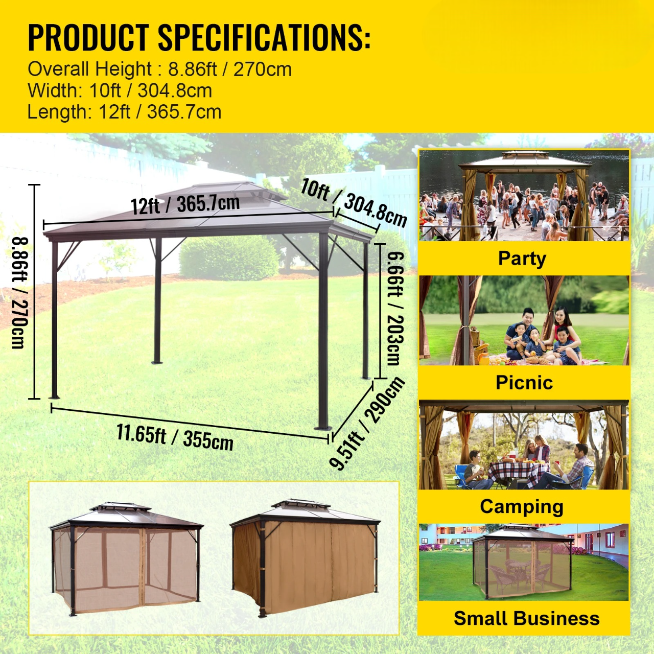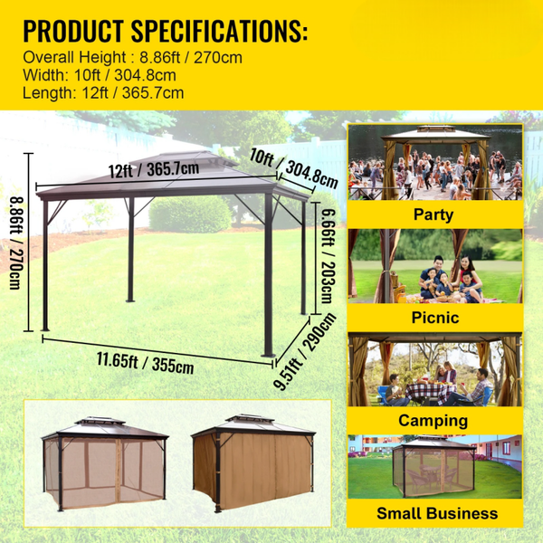 De overkapping is voorzien van hoogwaardige gordijnen van 180g polyesterdoek én afsluitbaar muggengaas met ritsen. Zo geniet je ongestoord van je tuin, zonder hinder van regen of insecten. Met een royale afmeting van 3 x 3 meter (10x10 ft) of 3 x 3,6 meter (10x12 ft) biedt dit tuinhuisje ruimte aan 6 tot 8 personen – ideaal voor gezellige diners, tuinfeesten of gewoon relaxen met familie en vrienden.