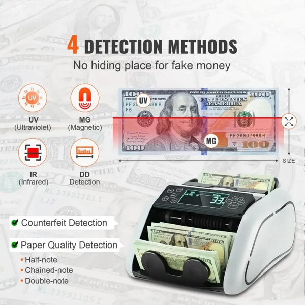 Voor optimale betrouwbaarheid is de geldtelmachine uitgerust met meerdere detectiemethoden voor het herkennen van valse biljetten, waaronder UV, MG (magnetisch), IR (infrarood) en DD (dubbel biljet detectie). Zo ben je altijd beschermd tegen fraude.