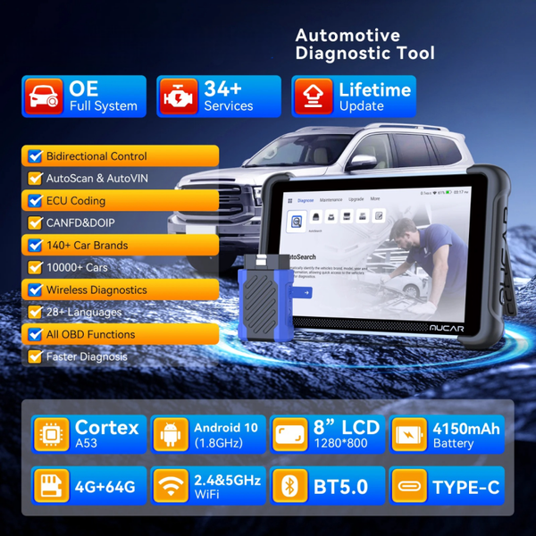 De scanner is uitgerust met een 8 inch touchscreen, draait op Android 10 met quad-core processor en biedt een snelle en gebruiksvriendelijke ervaring. Dankzij de Bluetooth- en WiFi-verbinding (2.4G/5G) werkt het systeem draadloos en ontvangt u gratis levenslange updates, zonder jaarlijkse kosten.